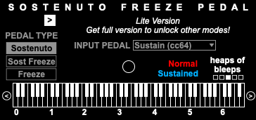 This Max MIDI Effect is a Lite version of the Sostenuto Freeze Pedal. This version only gives you Sostenuto mode, disabling Freeze and Sostenuto Freeze modes. It also disables the input pedal selection so you can only use cc64 (the normal sustain pedal input) to control it.