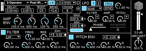 Use midi to polyphonically pitch shift that audio and alter it with basic sampling techniques. You get amplitude, pitch, and filter envelopes as well as 2 LFOs that can modulate the filter, amplitude, and pitch and can be set to either sync or free running mode..