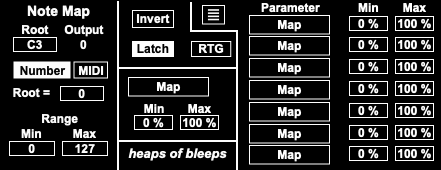 This Max for Live MIDI effect helps you precisely map your MIDI notes to any parameter, without having to fiddle with 0-100% ranges. To make it work just set the “Min” and “Max” parameters to the same as the range of the parameter you’re mapping to. These can be set in whole numbers or MIDI notes. Then set what you want your root note to be with the “Root” parameter. Then set the output value you want your root note to equal, with the “Root =“ parameter. This can also be set in numbers or MIDI notes, by flipping the “Mode” tab to choose between them. Then, use the “Map” button to map it to any automatable parameter. Click on the “Map” button, followed by the parameter you want to map the device too. Your incoming MIDI notes will now be precisely mapped onto the parameter. This means you can control your parameter with clips of MIDI notes. This provides ample opportunities for precise modulation, similar to using notes to control CV in on a modular or analog synth. All notes outside of the range will be clipped.